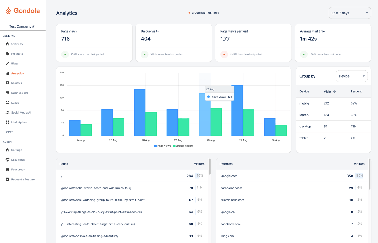 Why it matters: Google Analytics 4 has made website analytics more difficult, requiring custom dashboards that most people don’t have the time or expertise to set up. Many Gondola customers do not even have Google Analytics installed. This integrated analytics solution a combination of the simplicity of the old version of Google Analytics, and the power of insights that you need to understand your website performance over time. In short, this provides simple, integrated website analytics right within your account dashboard. It gives you the data you need to see how your website is performing over time, without the complexity of traditional analytics platforms.